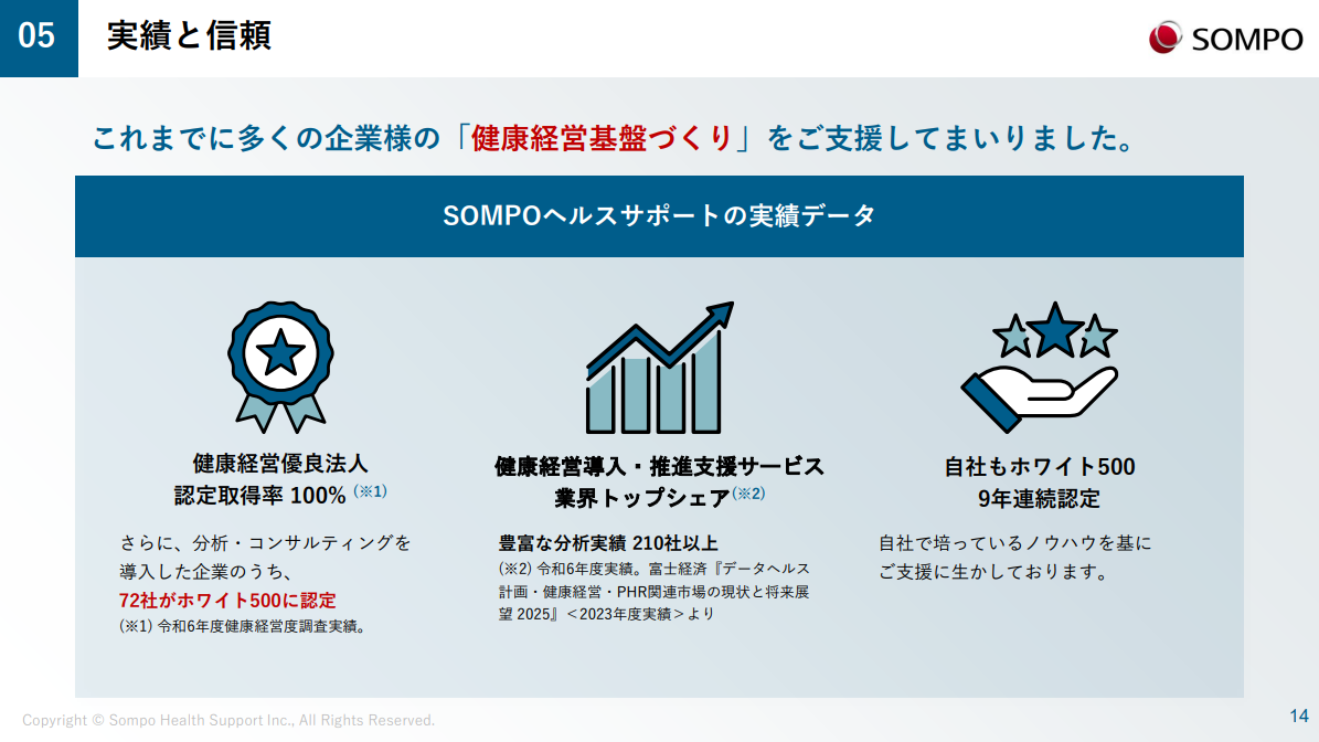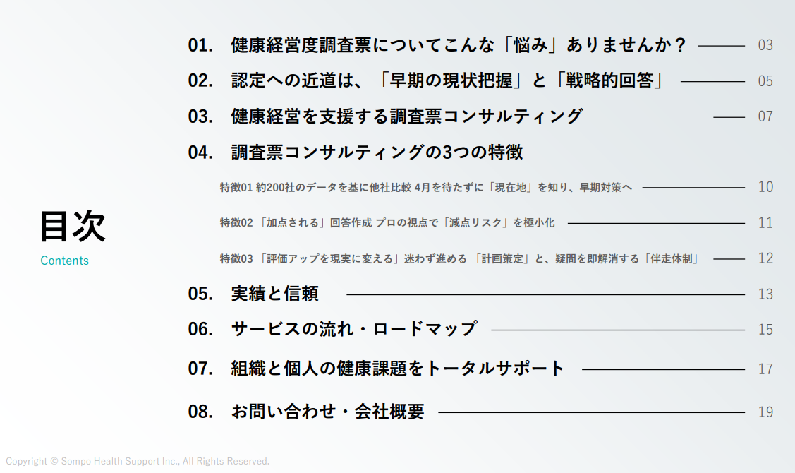 2026.03.05 UP 健康経営 健康経営度調査票 「評価アップ」と「認定」への最短ルート 健康経営優良法人の認定、特に上位の「ホワイト500」を継続的に獲得している企業には、ある共通した「鉄則」があるのをご存知でしょうか?このたび、私たちの分析実績から導き出した「評価アップへの最短ルート」の鉄則を資料にいたしました。また、プロの知見から、私たちがコンサルティングを通じてどのように成功まで伴走しているのかについても解説しています。 一覧に戻る